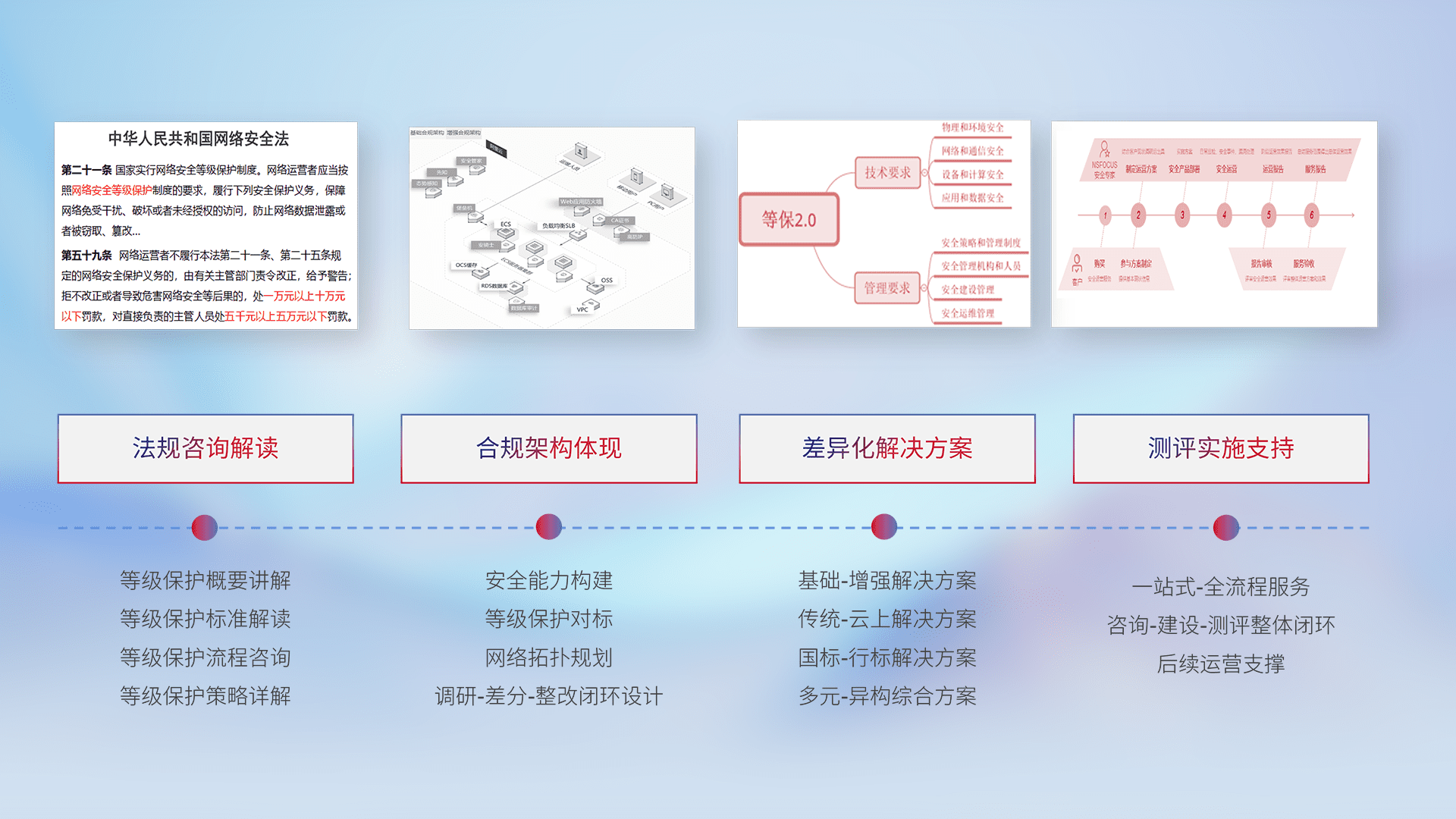 通过专业的法律咨询解读、、、、合规架构体现、、差异化解决方案、、测试实施支持等服务,,为客户量身打造等保合规体系。。。。
